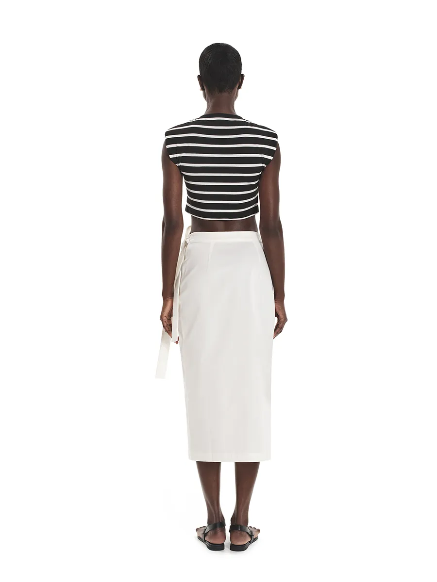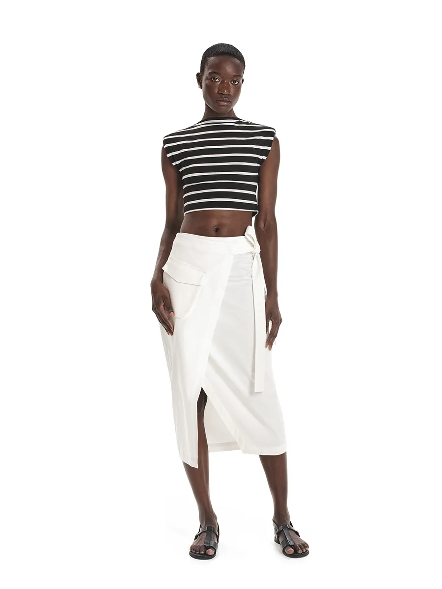 Εφαρμοστό crop top από ζέρσεϊ βισκόζη με statement ριγέ σχέδιο με βάτες ριχτή καβαδούρα. Ένα εξαιρετικά καλοκαιρινό σχέδιο που κολακεύει τη σιλουέτα και μπορεί να συνδυαστεί με τα κάτω μέρη της συλλογής με αποτέλεσμα κομψά outfits.