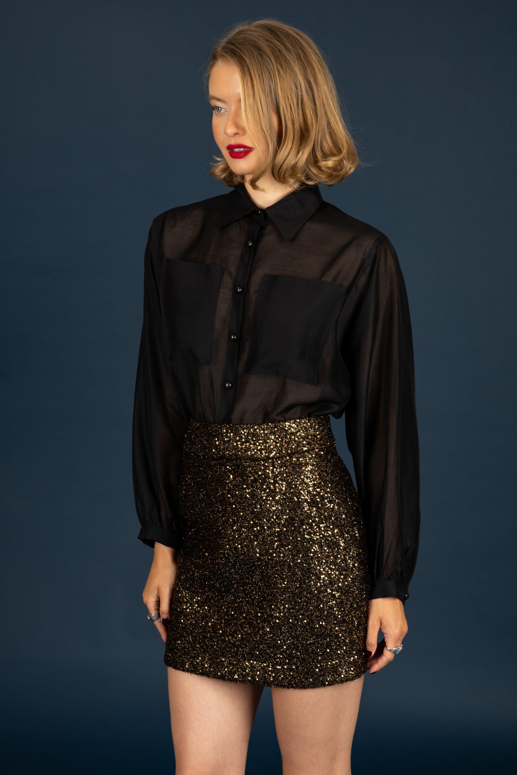 Πουκάμισο σε ίσια γραμμή με  ελαφριά διαφάνεια. Διαθέτει δύο εξωτερικές τσέπες και εμφανή κουμπιά.