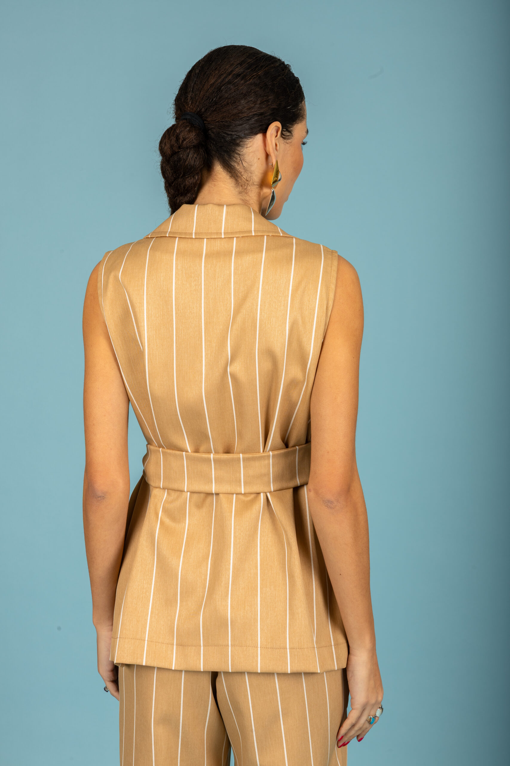 Αμάνικο ριγέ blazer με πέτο γιακά, με ζώνη που μπορεί να φορεθεί με ή χωρίς τη ζώνη.