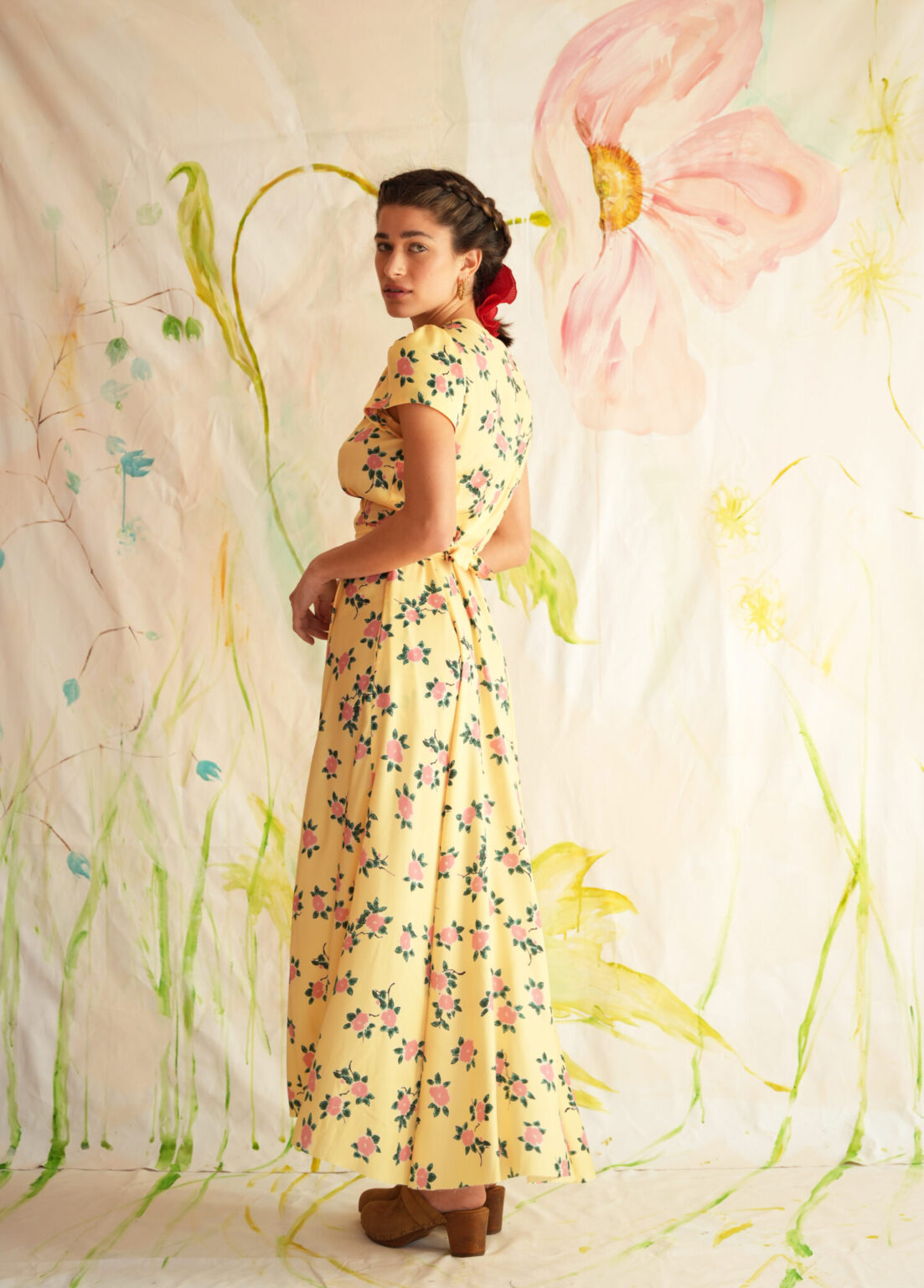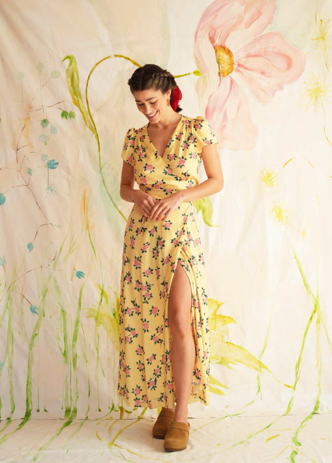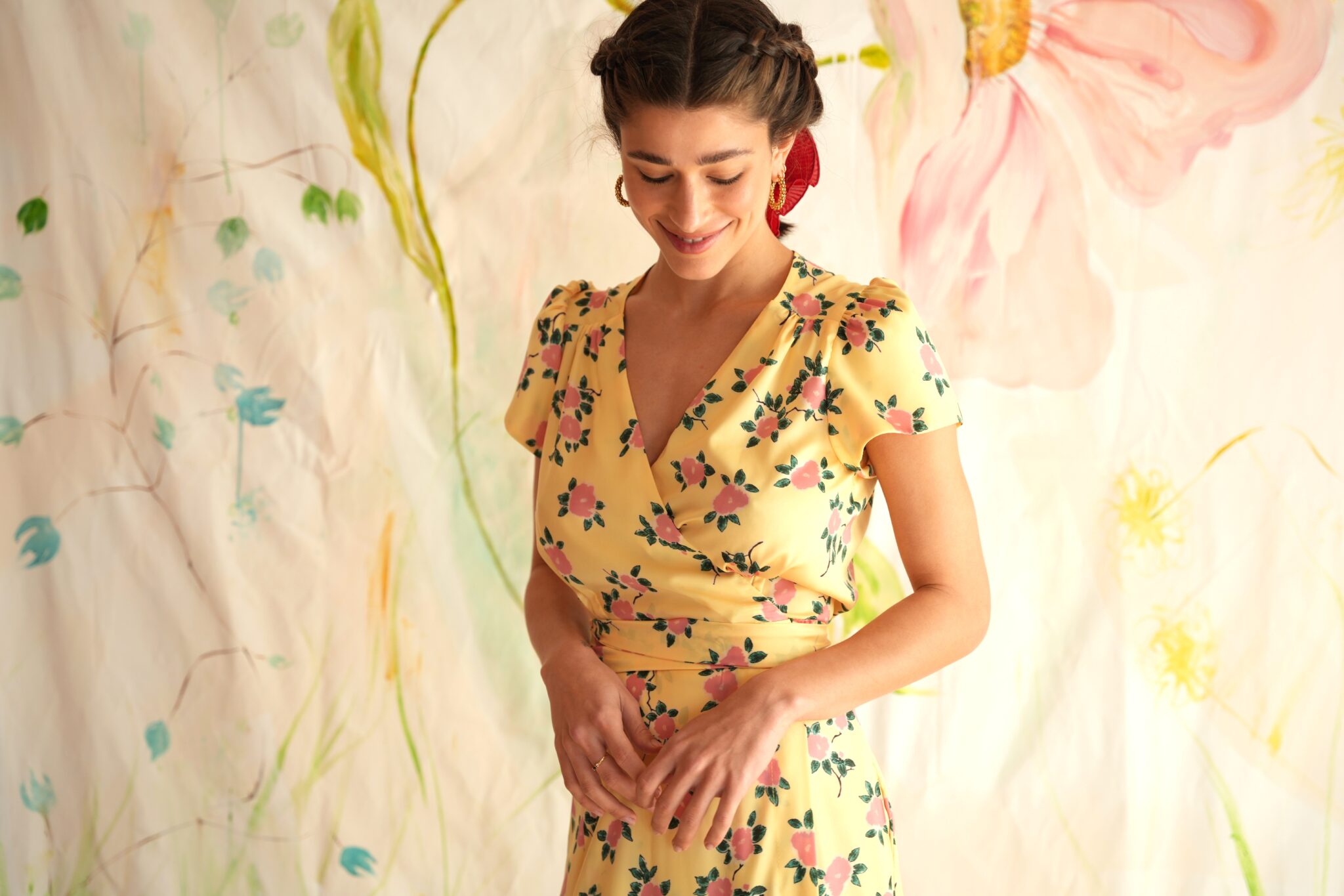 Kλασσικό shoushou μίντι κρουαζέ φόρεμα με ζώνη. Το print είναι floral και η  εφαρμογή κανονική.
