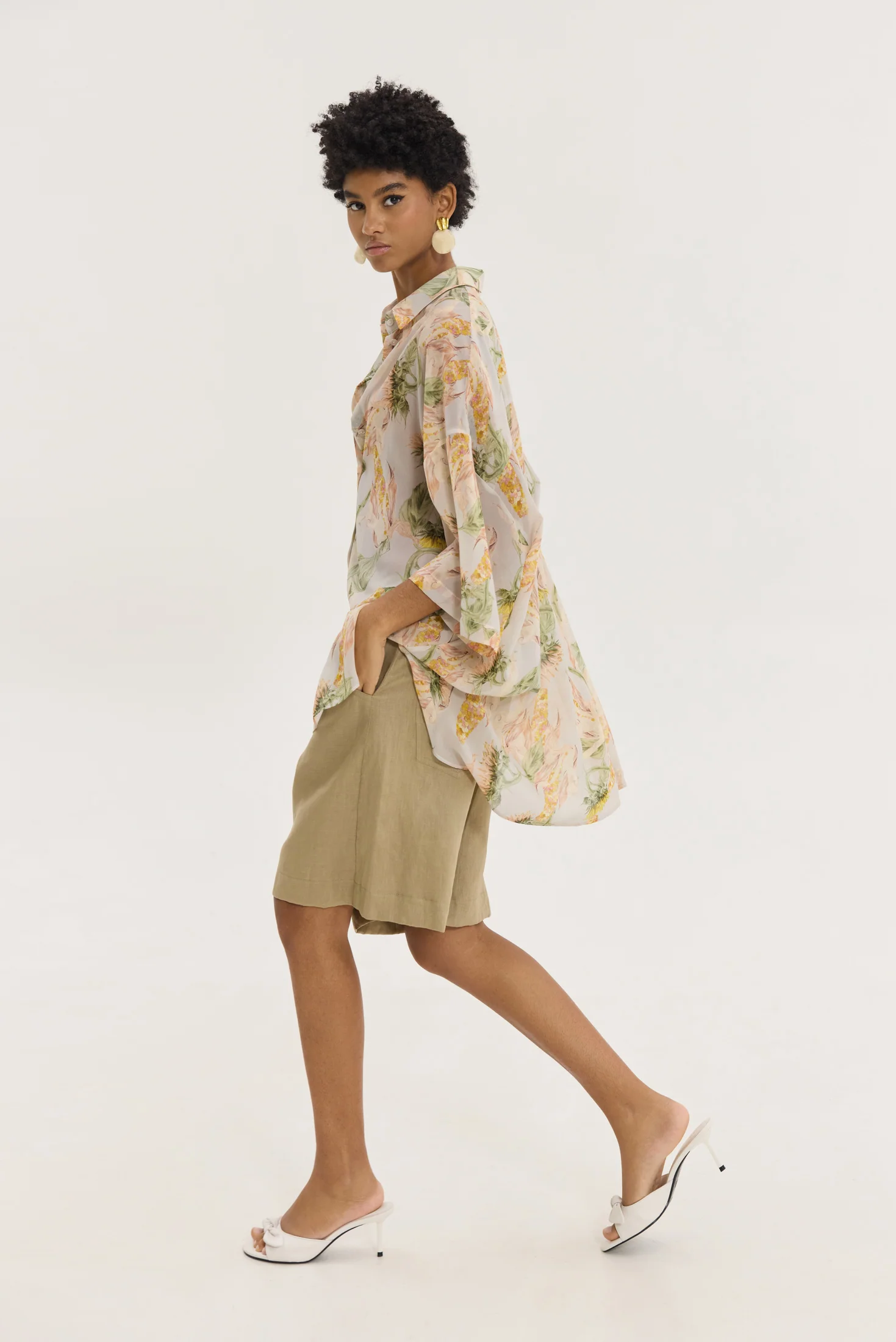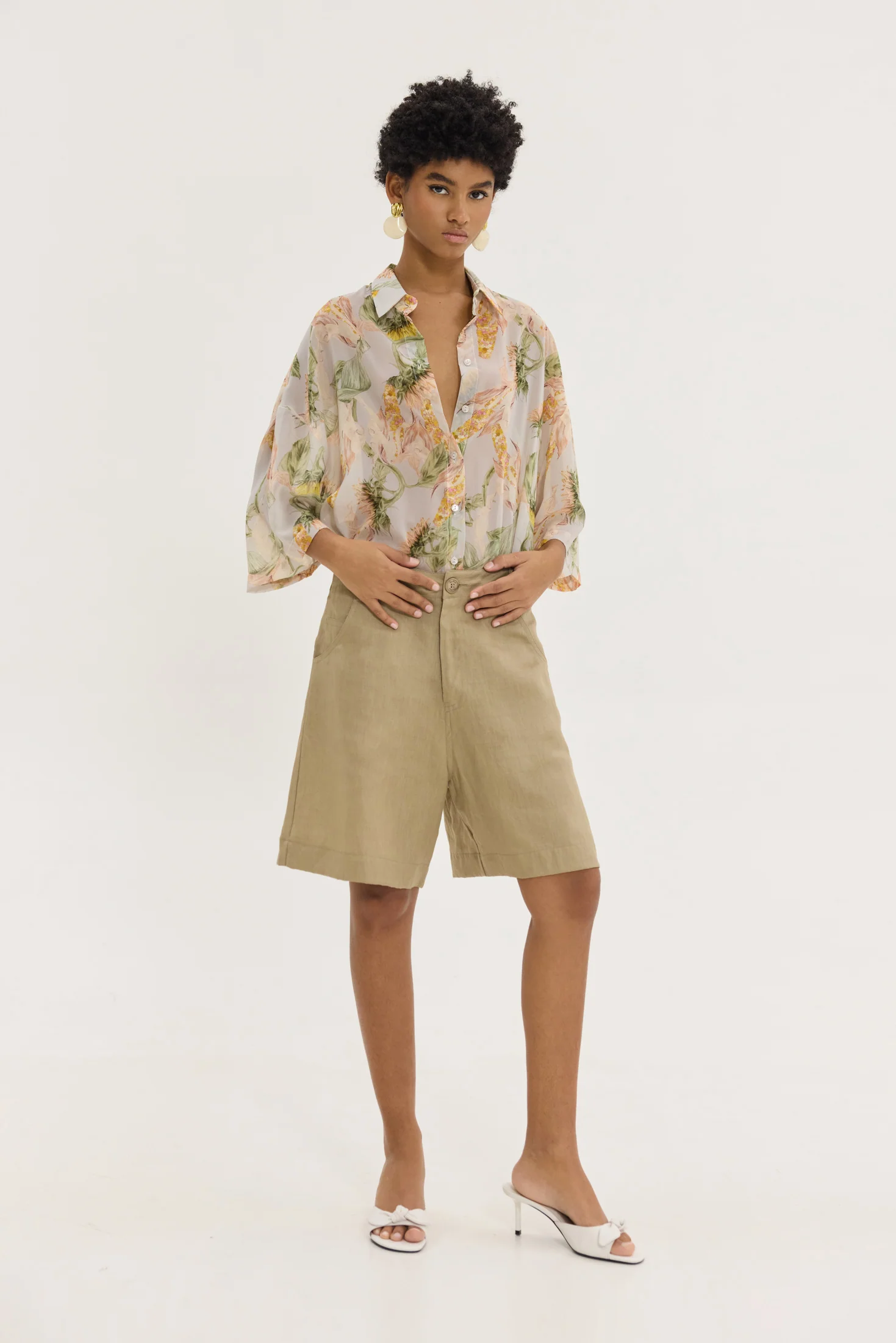 Βερμούδα σε φαρδιά γραμμή, από λινό ύφασμα, μήκος λίγο πάνω από το γόνατο, κλείσιμο με κουμπιά και φερμουάρ, θυλάκια για ζώνη, 5τσεπο design, εξωτερικές τσέπες στο πίσω μέρος.